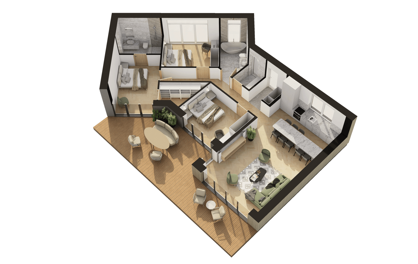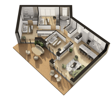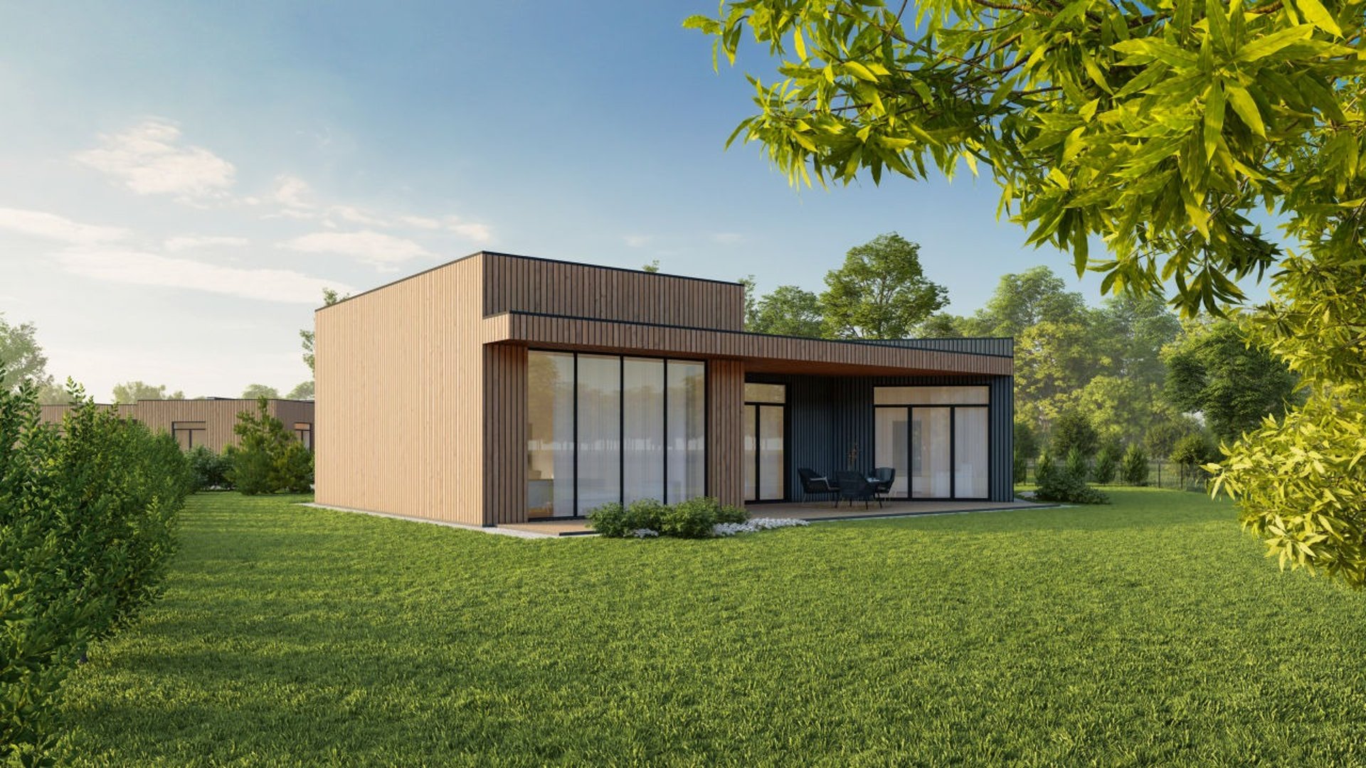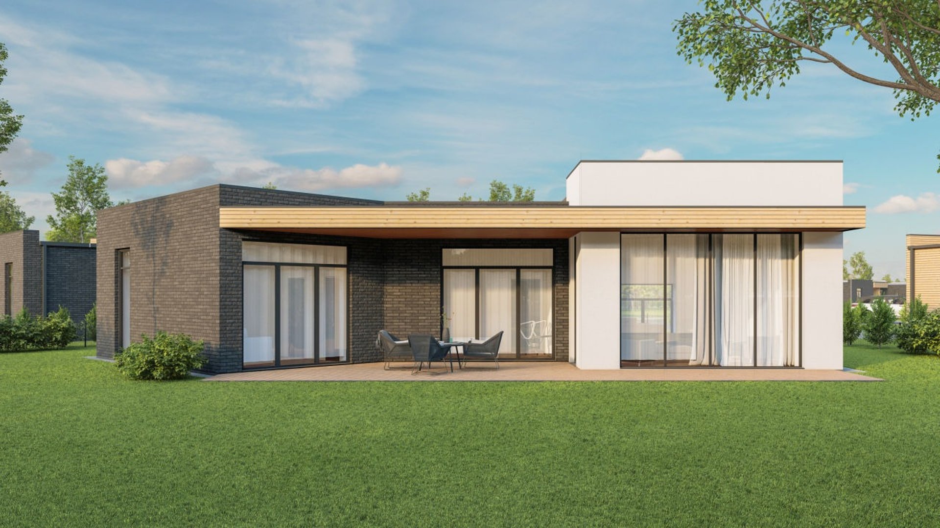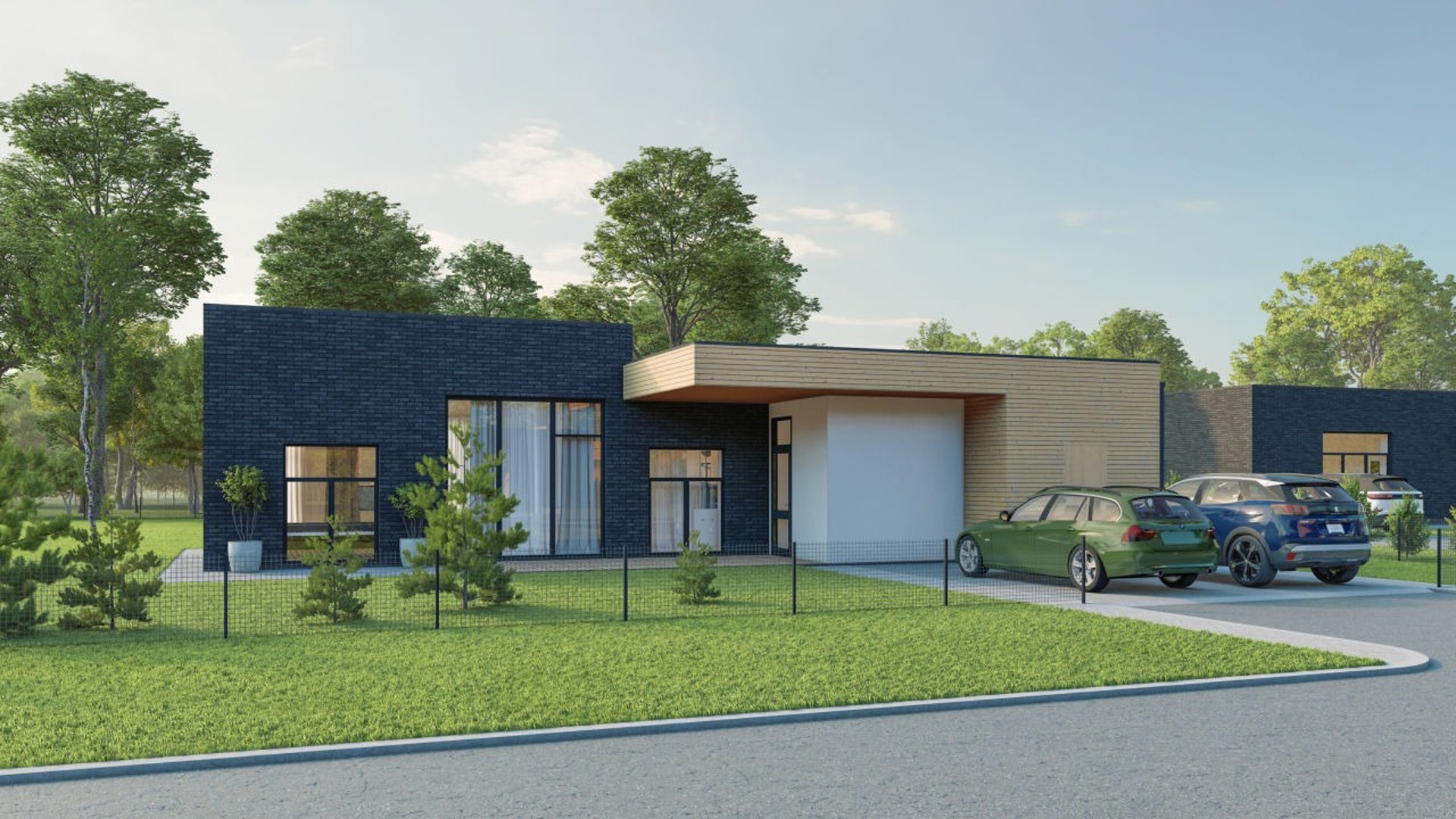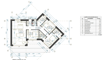 112 m² A++ energetinės klasės mūrinis namas sukurtas taip, kad jaustųsi tikra gyvenimo ramybė. Įžengus atsiveria erdvi svetainės ir virtuvės zona su dideliais langais — daug šviesos ir vietos kasdienei veiklai. Miegamieji išdėstyti atokiau, pasiekiami per švelniai „užsukantį“ koridorių — toks architektūrinis sprendimas padeda išlaikyti jaukumą ir erdvės pojūtį. Du sanitariniai mazgai ir sandėliukas užtikrina patogų kasdienį gyvenimą.